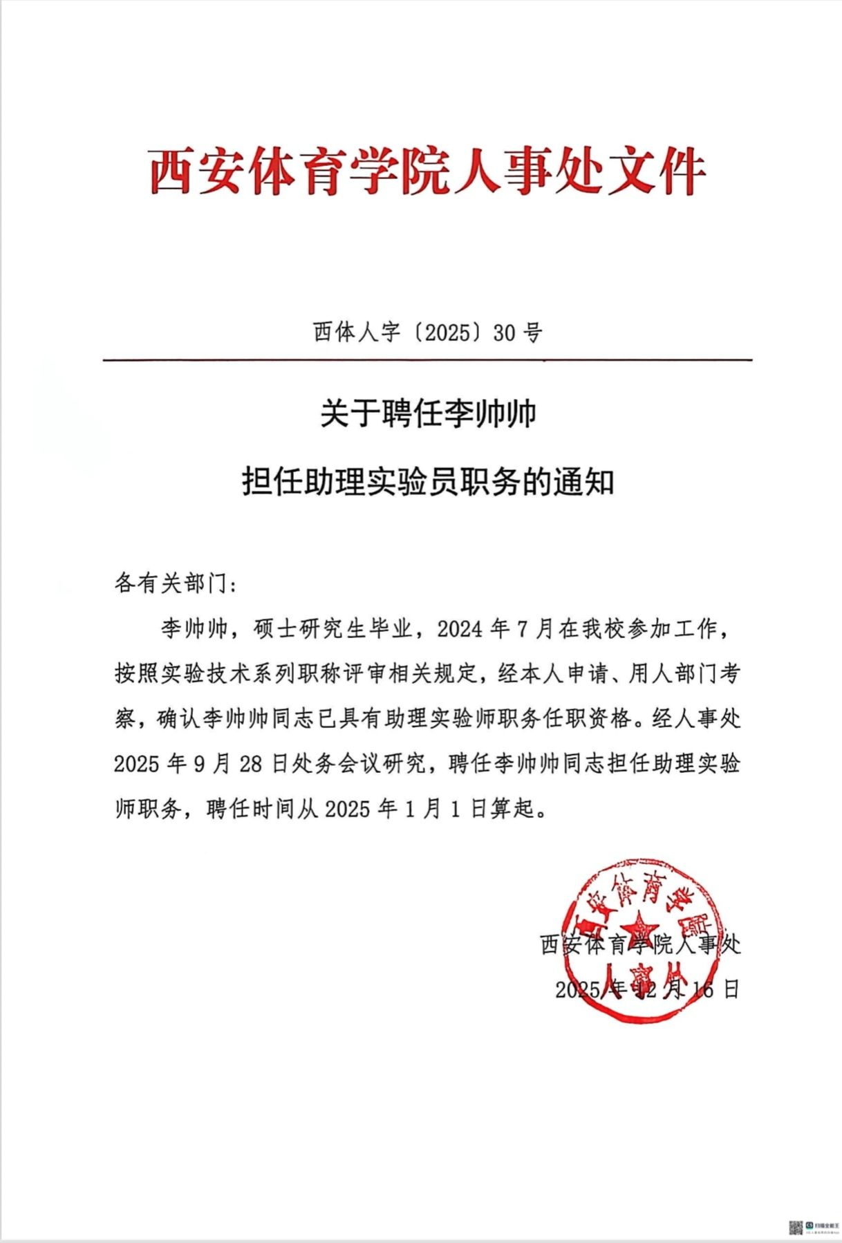 关于聘任李帅帅、郑兴慈担任助理实验员职务的通知