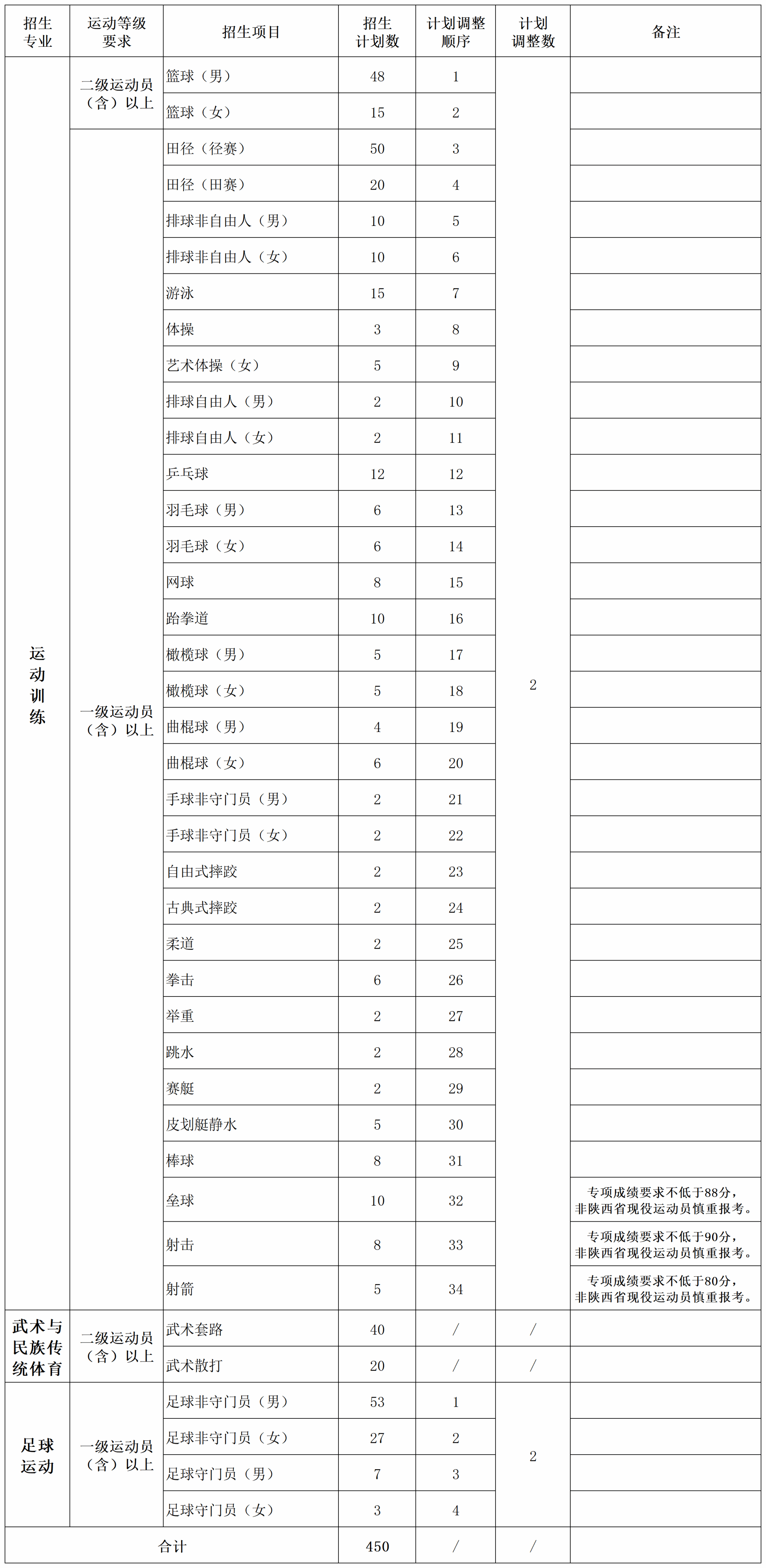 (一)运动训练专业计划招生300人,武术与民族传统体育专业计划招生60人,足球运动专业计划招生90人,共计450名(含录取优秀运动员保送计划)。